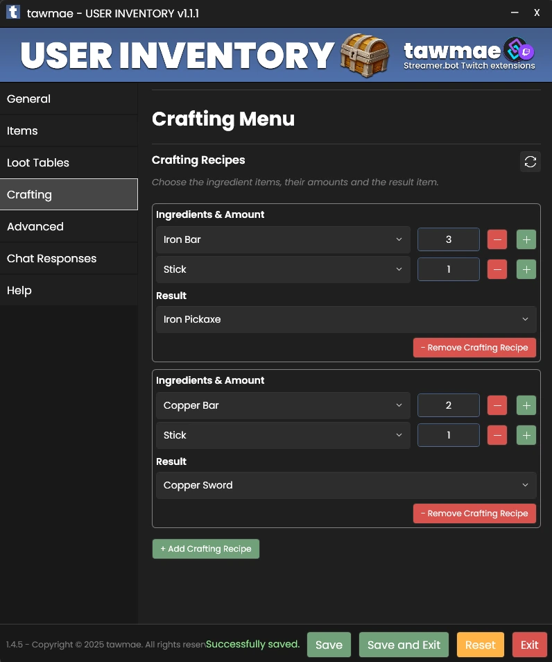 September 17, 2025 Added crafting; fixed an issue with Get Inventory responses not updating when changed in the settings UI 1.1.1